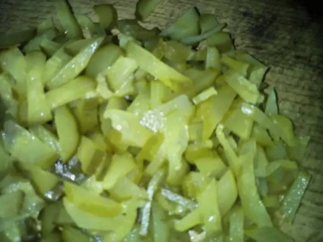 - Giet de pekel in een pan en breng aan de kook, en filter dan in de bouillon. Schil de komkommers en hak ze fijn.
