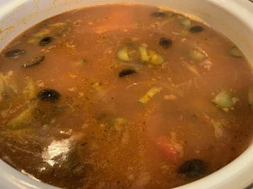 - Voeg kappertjes, olijven en pekel toe aan de soep. Roer de soep, kook nog een paar minuten en haal van het vuur.