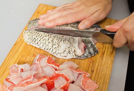 - Scheid visfilets van botten, vel en vinnen. We doen alles behalve de filet in een pan.