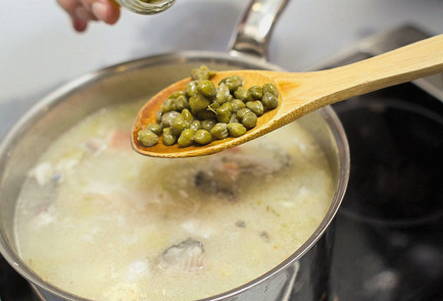 Schenk de rest van de bouillon in een pan, doe de gesneden visfilets, kappertjes en olijven erin. Voeg peper en zout naar smaak toe. We vallen in slaap komkommers.