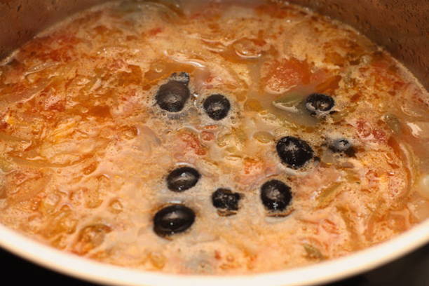 - Voeg ui met pasta, olijven en komkommer toe aan de bouillon. Breng het aan de kook.