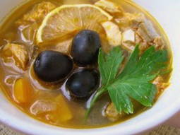 Gastronomische steursoep, gezond en lekker, die vrij eenvoudig te bereiden is. Visbouillon wordt ideaal gecombineerd met augurken en olijven, en citroensap zal de uitgesproken vissmaak aangenaam doen uitkomen.