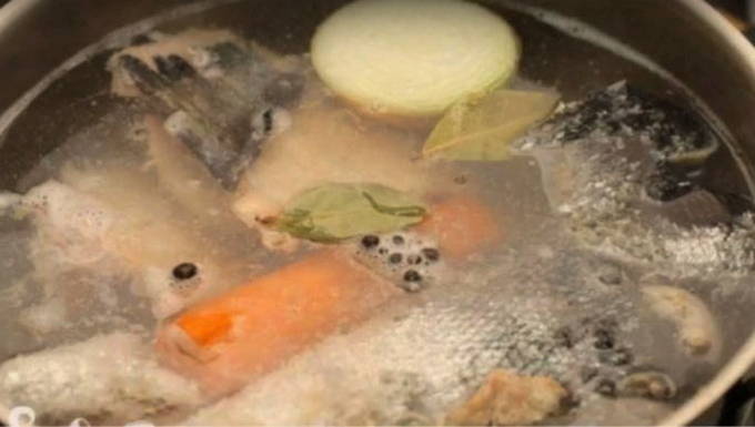 - We snijden verse vis. Plaats botten, koppen en staarten in een pan en vul met koud water.