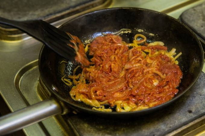 - Voeg tomatenpuree toe aan de gebakken uien. Zout naar smaak.