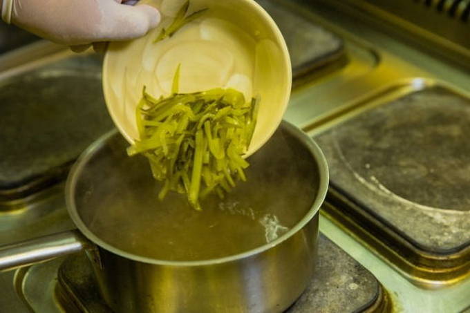 - Doe de gemene in de kokende bouillon. Voeg er ui met komkommer, kappertjes en laurier aan toe en breng alles aan de kook. Giet het vocht van de olijven bij de bouillon. Voeg greens toe aan de afgewerkte soep.