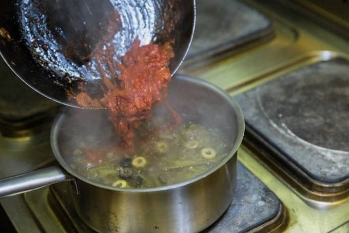 - Doe de tomatenpuree in de pan, meng alle ingrediënten en laat alles samen sudderen.
