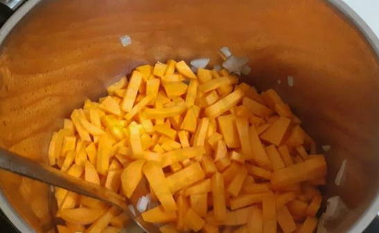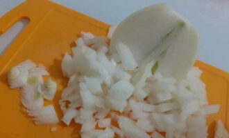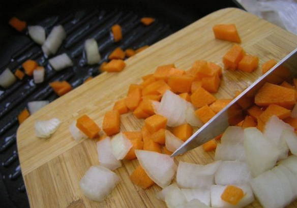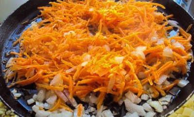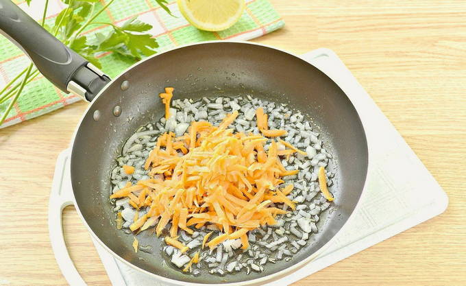 - Snipper de ui en wortel. Bak groenten tot ze zacht zijn in plantaardige olie. Ongeveer 3-5 minuten.