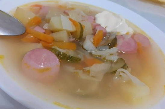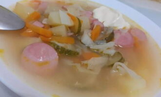 - Rijke soep met worstjes is klaar. Schenk de lekkernijen in borden en serveer!