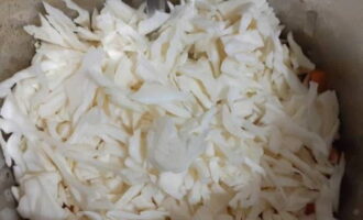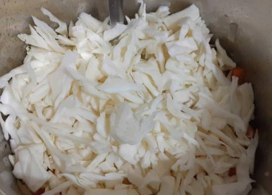 Maal witte kool. Doe alle voorbereide groenten in een pan.