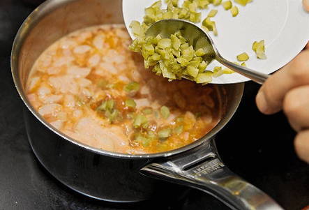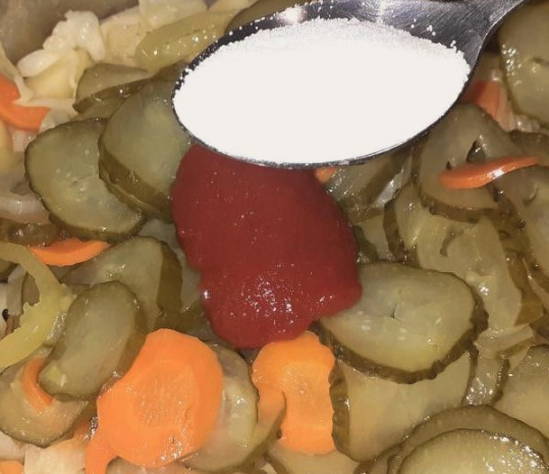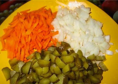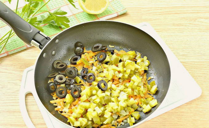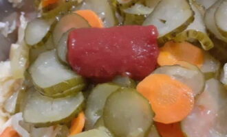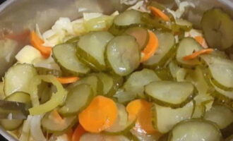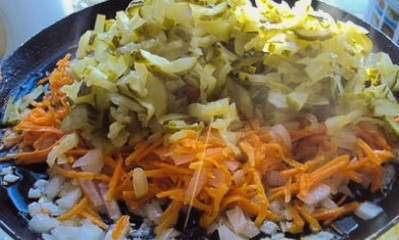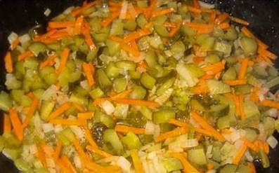 - Snipper de ui en wortel. We bakken de groenten en voegen er vervolgens fijngehakte komkommers en zuurkool aan toe. Laat 10 minuten sudderen in tomatensaus.