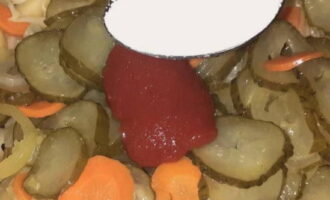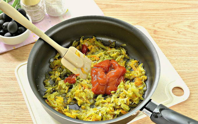 - We verspreiden de zuurkool en tomatenpuree, roeren de inhoud en laten nog 5 minuten op laag vuur sudderen.
