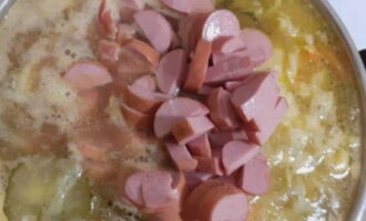 - We verschuiven het frituren naar de bouillon met aardappelen. Voeg fijngesneden worstjes direct toe. We voegen zout toe aan het gerecht en houden het nog 10-15 minuten op het fornuis.