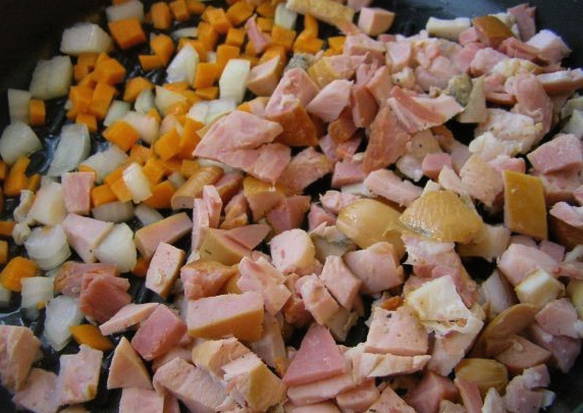 - We snijden ook worstjes in kleine blokjes. We zetten ze met groenten en blijven bakken.