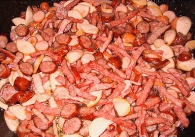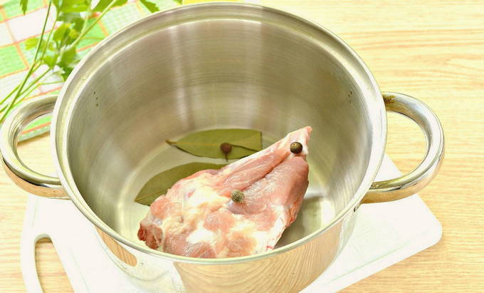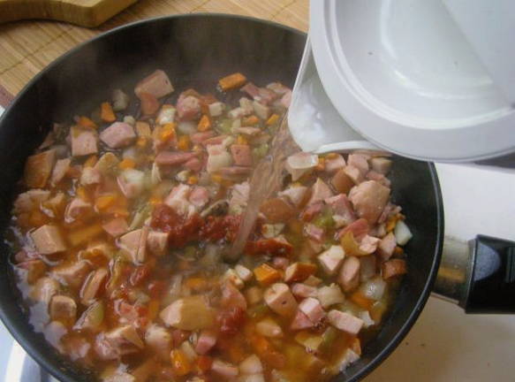 - Kook water in een pan. Daar dompelen we het gebraad onder. We voegen ook fijngehakte worstjes met augurken toe. Kook op laag vuur gedurende 10 minuten en haal van het fornuis.
