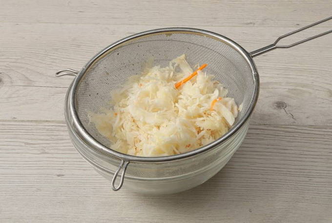 - Doe de zuurkool in een vergiet, giet het overtollige sap eruit. We sturen het product naar de pan. We sudderen het gerecht ongeveer 10 minuten.