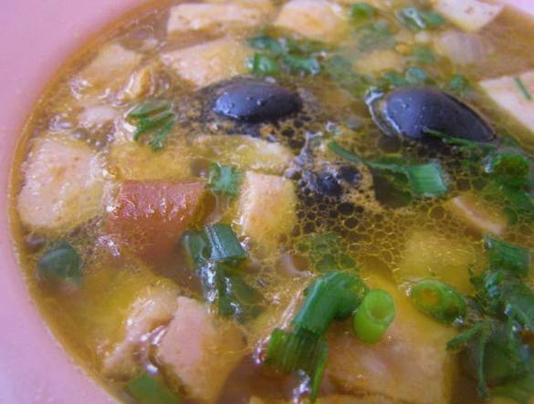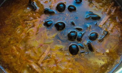 - We brengen het groentemengsel over naar de bouillon. We sturen hier ook worstblokjes naar toe. Zout het gerecht en bestrooi met kruiden. Kook nog 20 minuten en voeg op het einde de schijfjes citroen en olijven toe.