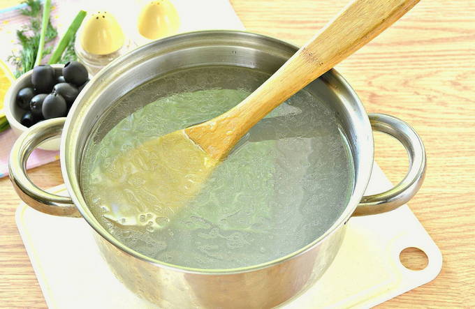 - Leg 5 minuten voor het koken de fijngehakte olijven neer en giet de augurk in de komkommer. Zout naar smaak.