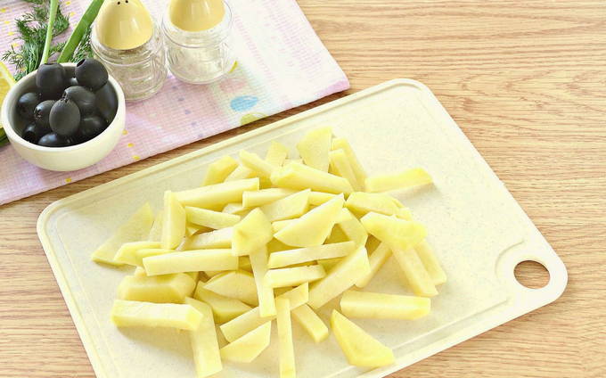 Snijd aardappelen in blokjes. We tellen het op bij de totale massa. Roer de inhoud en laat 5 minuten in een pan sudderen, overgiet met plantaardige olie.
