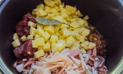 Zelfgemaakte mengelmoes kan eenvoudig en snel worden bereid in een multicooker. Deze smakelijke soep is perfect voor een stevige familiemaaltijd. Serveer met zure room, brood of kruiden!