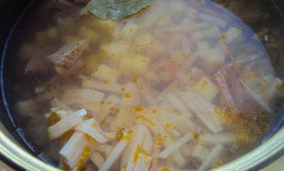 - Doe het rundvlees in een pan met kruiden en laurierblaadjes. Kook de bouillon.