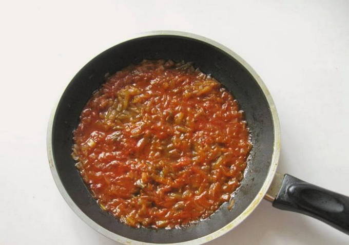 - Bak eerst de gesnipperde uien in olie, vul het dan met tomatenpuree, roer en laat nog 5-7 minuten sudderen.