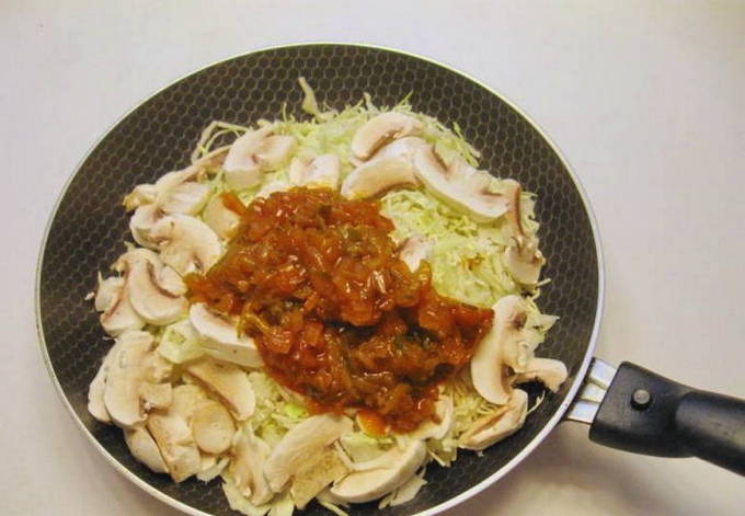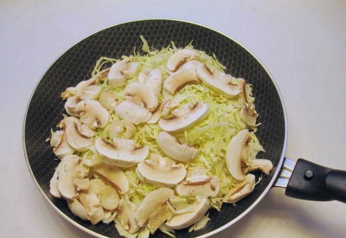 - Hak de witte kool fijn. We wassen de champignons en verdelen in dunne delen. Kook voedsel in een koekenpan, bestrooi met zout.