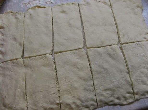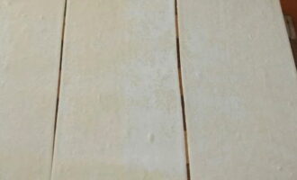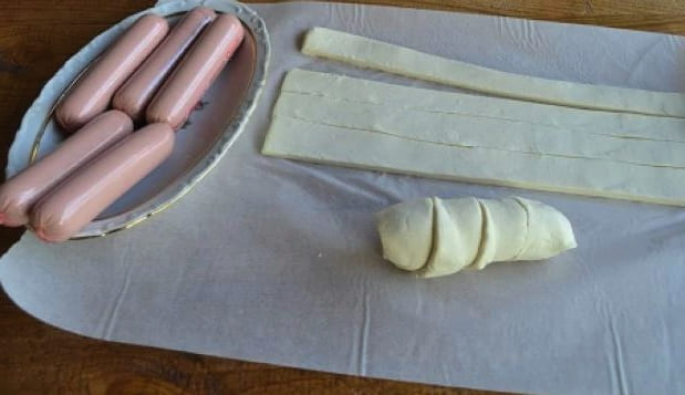 - Rol vervolgens het ontdooide deeg een beetje uit, snijd het in rechthoeken. Bepaal de lengte van de rechthoeken door de lengte van de worsten.