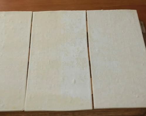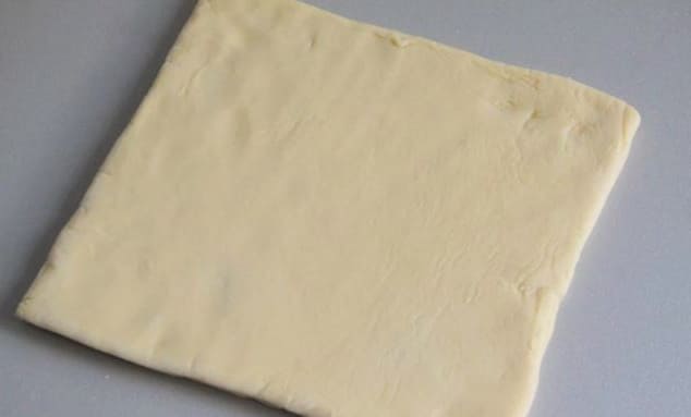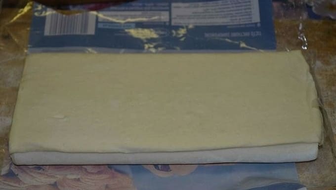 - Ontdooi het bladerdeeg - laat het 30 minuten op kamertemperatuur staan. Bestrooi vervolgens de werktafel met tarwebloem, leg het ontdooide deeg erop.