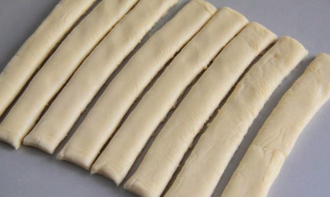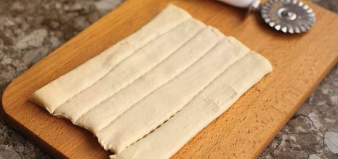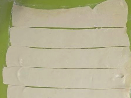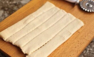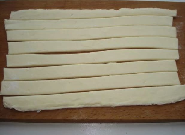 - Snijd het ontdooide deeg in dunne reepjes (8 stuks).