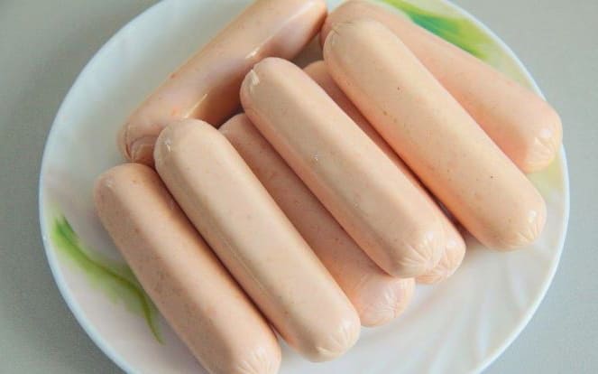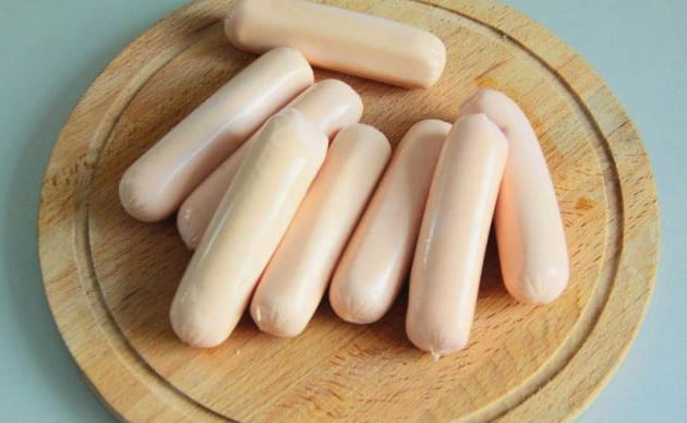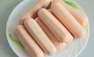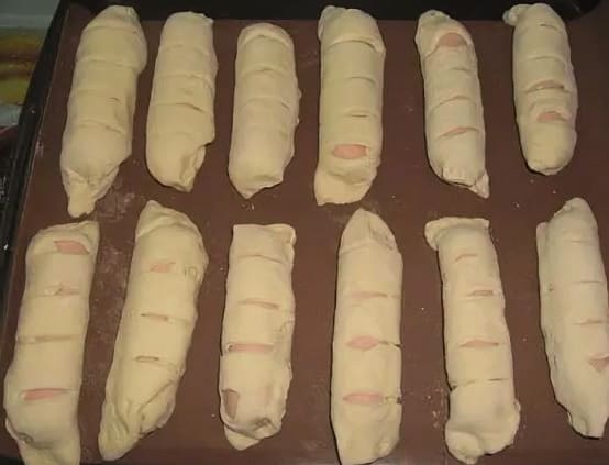 - Maak de worstjes van de films schoon. Elke worst moet in een strook deeg worden gewikkeld.