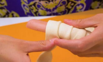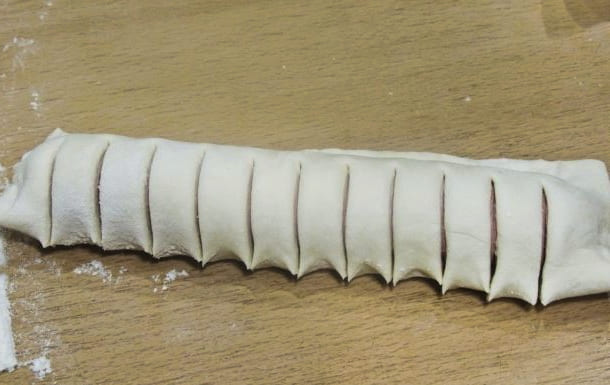 - We nemen een strook deeg, bevestigen de rand erop. Vervolgens leiden we het deeg in een spiraal, alsof we het in de sneden duwen.