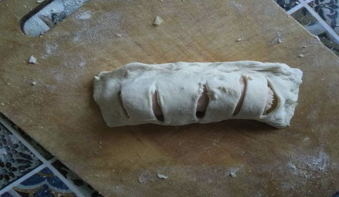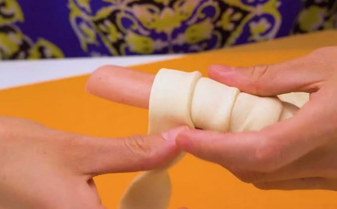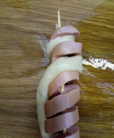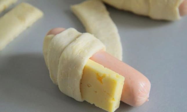 - Wikkel een worst met een stuk kaas met een reep deeg, nadat je het eerder in je handen hebt getrokken.