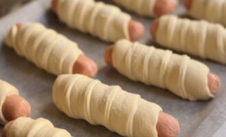 Bereid een bakplaat voor - bekleed deze met perkament. Daar doen we de worstjes in het deeg.