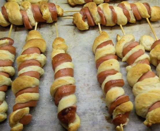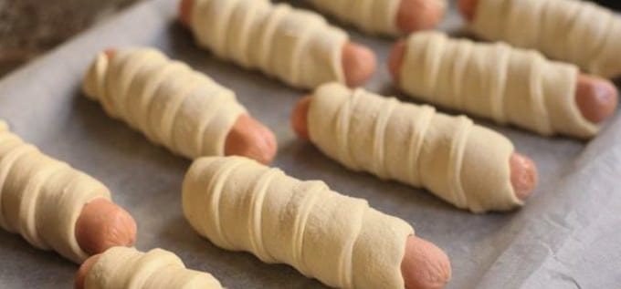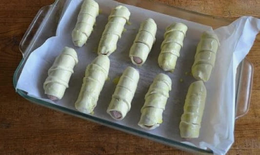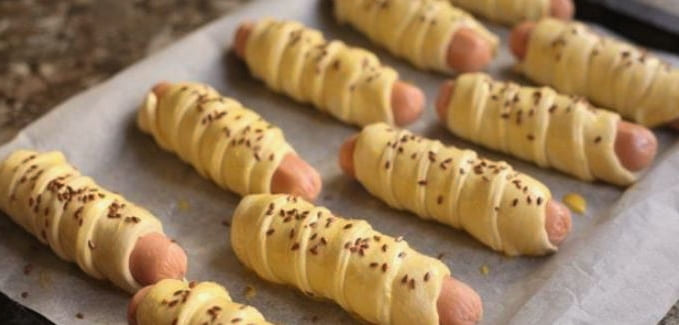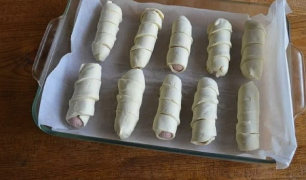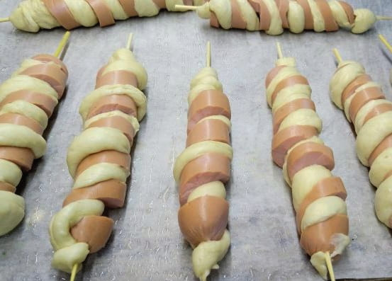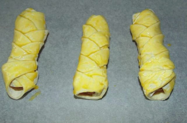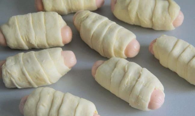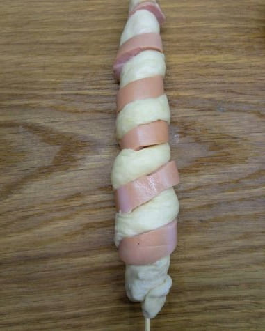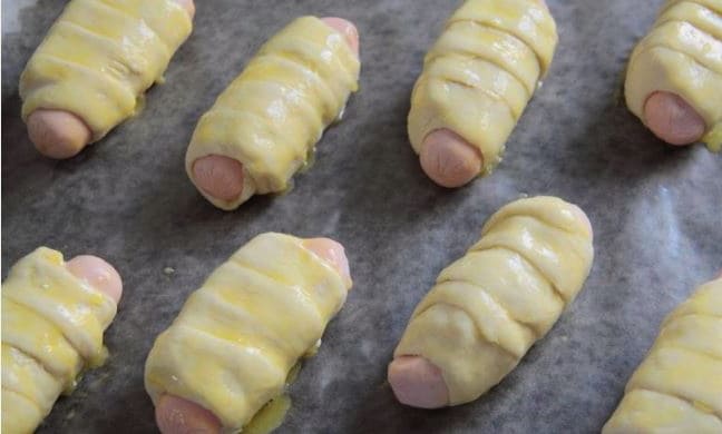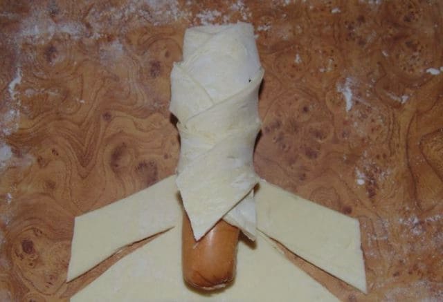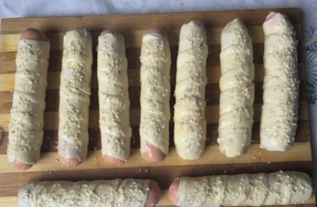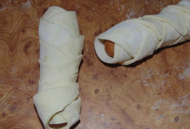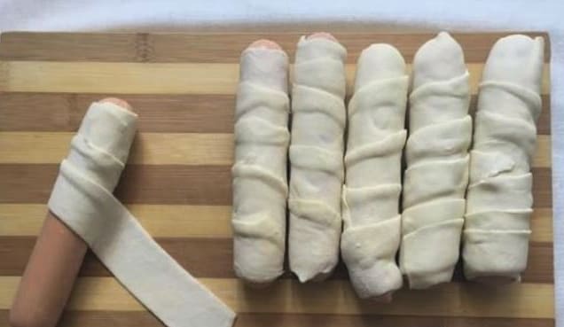 - We maken de worsten van de films schoon en wikkelen ze vervolgens met reepjes deeg.