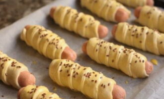 - Smeer de blanco's in met een losgeklopt ei. Leg alle worsten in het deeg op een bakplaat, stuur ze 15 minuten naar een voorverwarmde oven op 190 graden.