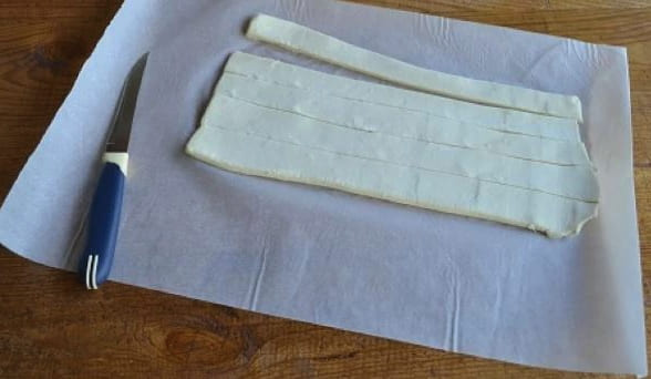 - Daarna moet je het bladerdeeg in dunne reepjes snijden.
