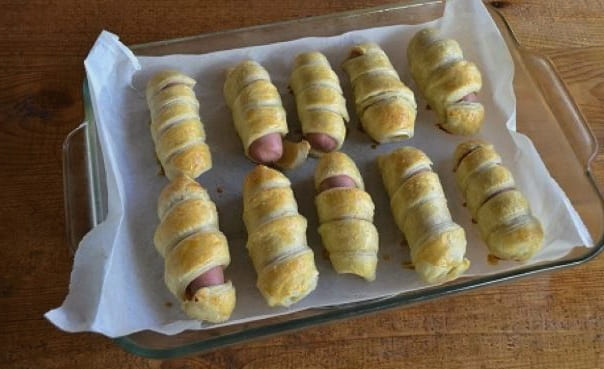 Worsten in een bladerdeeg gistvrij deeg, gebakken in de oven