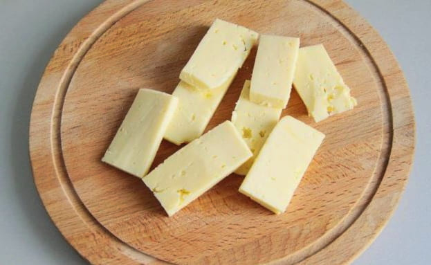 - Snijd de harde kaas in kleine stukjes. Hun grootte moet ongeveer even groot zijn als de worsten.