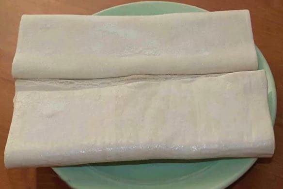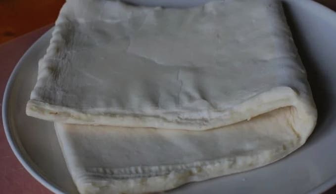 Het afgewerkte bladerdeeggistdeeg moet bij kamertemperatuur worden ontdooid. Om te voorkomen dat het deeg zijn gelaagde structuur verliest, mag u de oven of magnetron niet gebruiken om te ontdooien. Als het deeg zacht is, rol je het uit tot een dunne laag.
