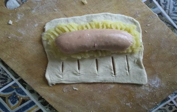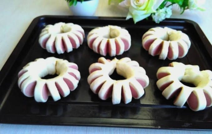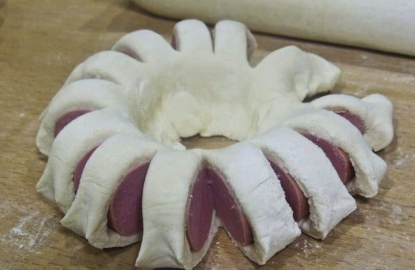 - Vervolgens moeten de worsten in het deeg in een ring worden gerold, zodat de sneden naar buiten komen. We knijpen voorzichtig de randen. Als gevolg hiervan krijg je visueel een bloem.