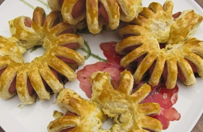 - Mooie worstjes in bladerdeeg met een bloem