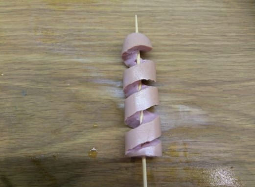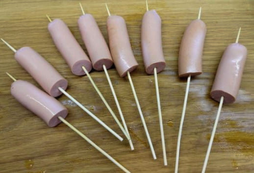 - We steken een spies in het midden van elke worst.