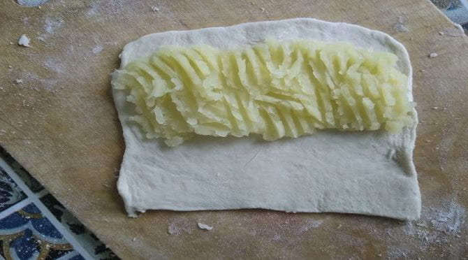 - Verdeel elke rechthoek visueel in twee delen. Verdeel de aardappelpuree over een deel, laat de rand een beetje los.