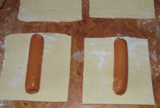 - Rol het ontdooide bladerdeeg een beetje uit, zonder de oorspronkelijke vorm aan te tasten. Snijd het deeg in 6 stukken. We verspreiden de worsten op elk stuk deeg.