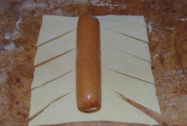 - Rol het deeg licht uit en verdeel het in 4 stukken - steek rechthoeken uit die qua grootte overeenkomen met de worsten. Leg de worstjes, gepeld uit films, in het midden van elke rechthoek.