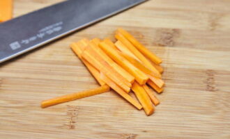 Snijd de gewassen aubergines in middelgrote blokjes, wortelen en uien in grote reepjes.