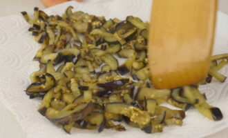 - Verwijder de schil van de aubergines, snijd ze in repen en bestrooi met zout, laat 15 minuten staan om de bitterheid te verwijderen en bak ze dan in kleine porties goudbruin en doe ze in een andere bak op papieren servetten om overtollig vet te verwijderen.