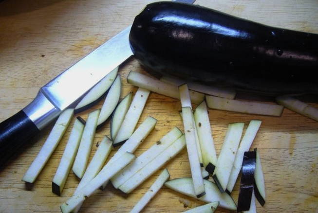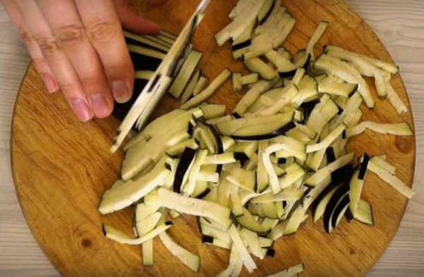 - We snijden de gewassen aubergines in de lengte in vrij dunne borden en leggen ze 30 minuten in gezouten water om de bitterheid te verwijderen.