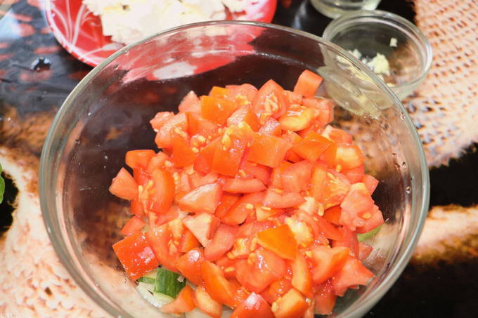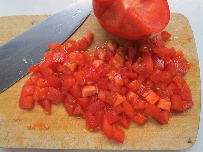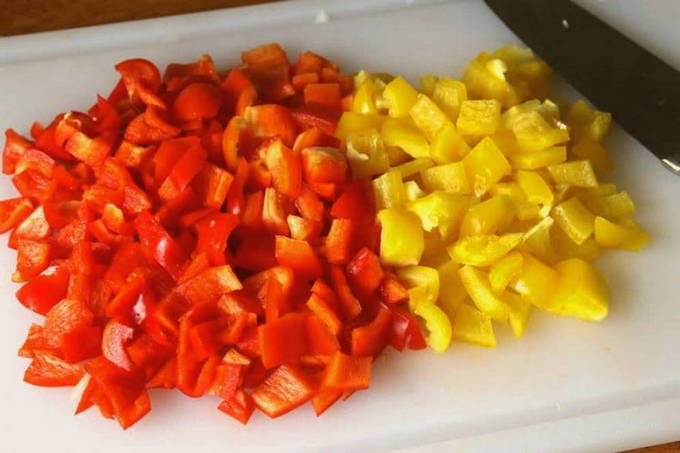 - We verwijderen de peper uit zaden en interne partities, hakken hem in een middelgrote kubus en plaatsen hem in een bak met andere voorbereide groenten. Dat doen we ook met tomaten.