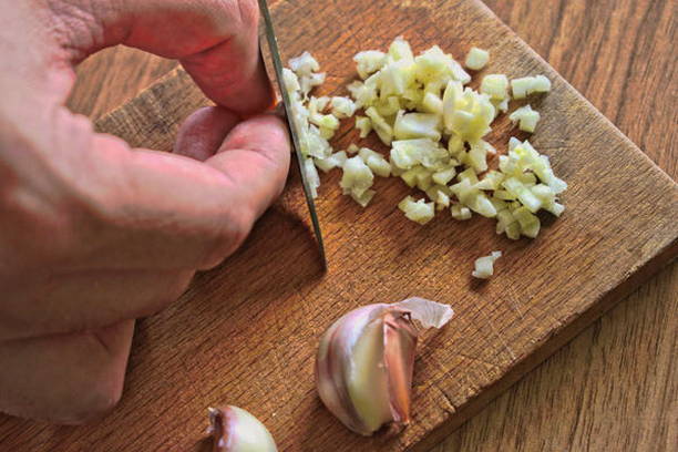 - Voeg 5 minuten voordat het gerecht helemaal gaar is gehakte knoflook toe aan de groenten.